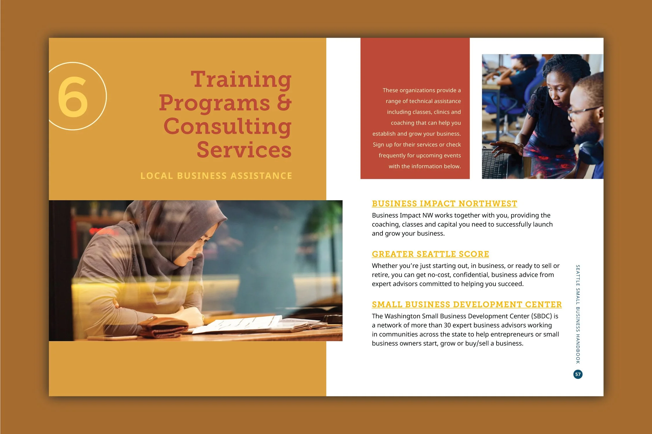 Photography added richness and visual interest, also helping to break up the text. I sourced a unified library of assets depicting Seattle small businesses and locations, as well as welcoming, inclusive shots that represented a broad range of industries, nationalities, cultures, gender identities, ages, and abilities. I wanted photos that truly reflected the diversity of small business owners in the Puget Sound area, so that users of this handbook would see themselves represented.