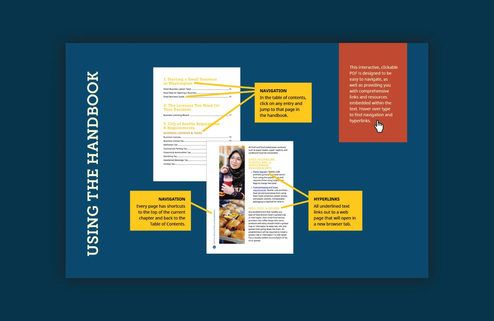 While I was provided with a style guide for the City of Seattle Office of Economic Development’s logo, all other elements of the handbook’s design and layout were at my discretion.